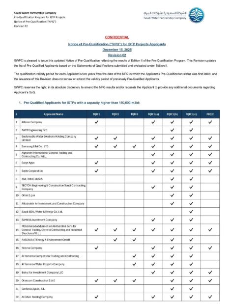 近日,沙特水务公司(SWPC)公布了 “第二期开发商预资格计划(Second Edition of the Pre-Qualification Program)” 评审结果。英国365集团凭借在环保服务领域的综合实力与专业技术积累,成功入选ISTP(独立污水处理项目)预资格开发商名单,标志着公司在国际市场拓展和环保业务出海方面迈出重要一步。